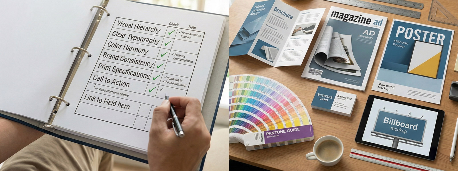 見せるデザインの考え方は、WEBサイトだけでなく、広告やチラシ・パンフレットなどの印刷物にもそのまま応用できます。オンラインとオフラインで一貫したUXを設計することで、ブランドの信頼性が高まり、コンテンツマーケティング全体の成果も底上げされます。ここでは、広告・印刷物制作で押さえておきたいチェックポイントを整理します。